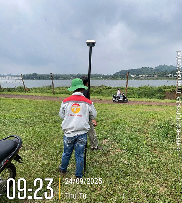 Kỹ thuật viên kiểm tra địa hình, xác định vị trí đặt máy, ranh giới theo mô tả và lựa chọn phương pháp đo phù hợp (GNSS/Toàn đạc/Flycam).